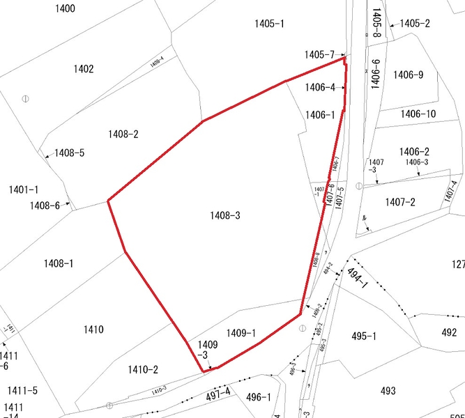 ※1406-1(696㎡・畑)、1407-1(56㎡・原野)、1408-3(5340㎡・畑)、※1409-1(590㎡・原野)